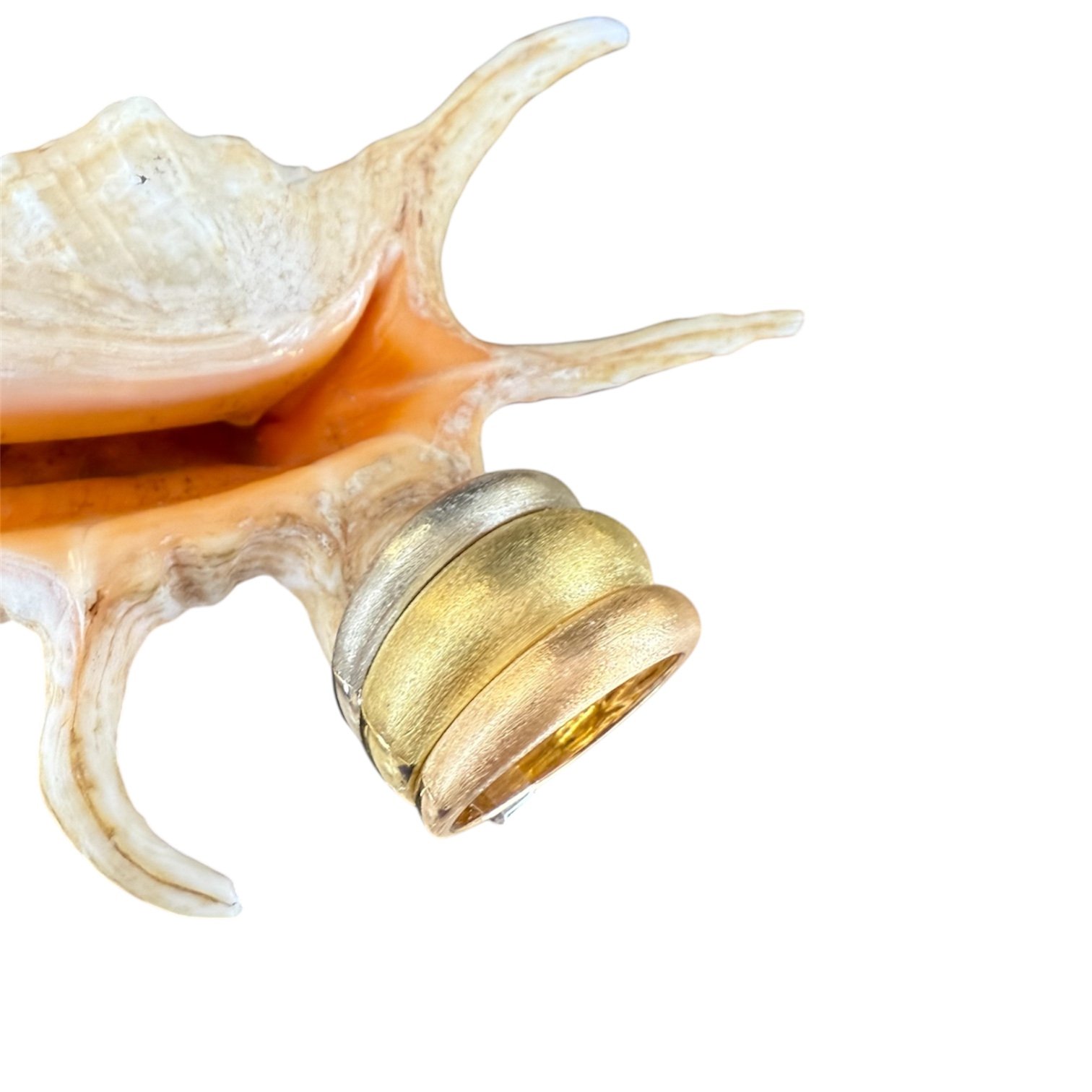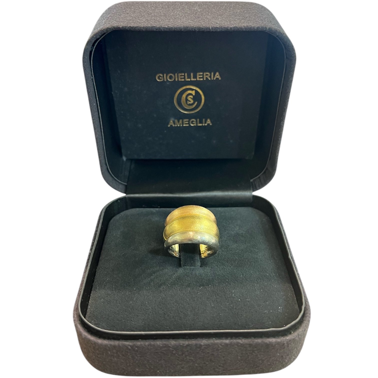 Anello caratterizzato dalla satinatura dei tre colori dell’oro.